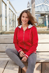 Hochwertige, weiche Sweat-Qualität, innen angeraut Gekämmte, ringgesponnene Baumwolle Strickbündchen mit Elasthan Kontraststreifen an Bund und Armbündchen Doppellagige Kapuze, innen in Kontrastfarbe Metallreißverschluss YKK Kängurutasche JN775: leicht tailliert, lässiger Schnitt